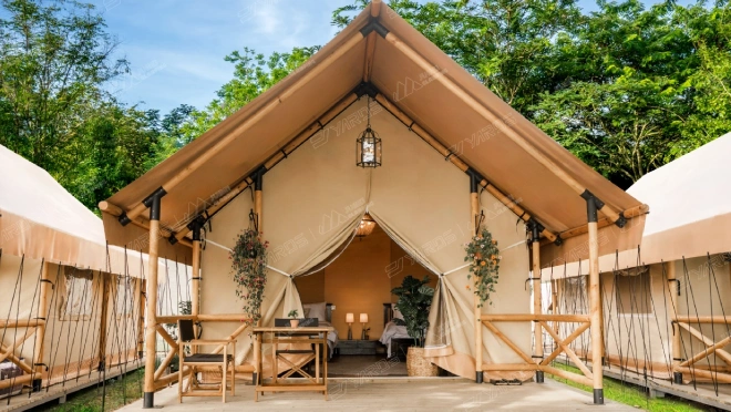 خيمة سفاري كلاسيكية فاخرة – B40 مستوحاة من خيمة الحائط الكلاسيكية. بعد التحسينات والترقيات، تتميز بشرفة أمامية واسعة، وإطار خشبي متين، وسقف من بلاستيك PVC عالي القوة، وجدران جانبية من قماش أكسفورد عالي الجودة، مما يوفر مساحة واسعة ومرنة، ويجعل هذه الخيمة كلاسيكية/قياسية فاخرة. كما أنها تُعد حاليًا من أكثر خيام السفاري مبيعًا لدينا. إنها خيار مثالي لأصحاب منتجعات التخييم الفاخر، والمخططين، والمستثمرين.