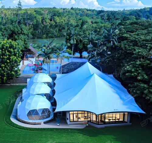 BBQ in a safari tent. Amazing experience! In this glamping resort, the owner used our safari tent to build 28 barbecue tents, using smaller models(for 2-4 people) such as: Basic Safari Tent – AX17, Compact Luxury Safari Tent – B32, and bigger ones(for 4-8 people): Luxury Safari Tent – B40. Use the super large (250m²) luxury lodge tent – YX as the customer service and food purchasing center. Due to the unique shape and feel of the safari tent and the pole-free space, it is very convenient for layout and decoration. In just 2 months, from construction to opening, it has attracted more than imagined customers to try it.