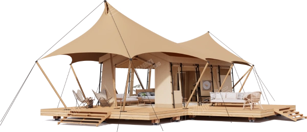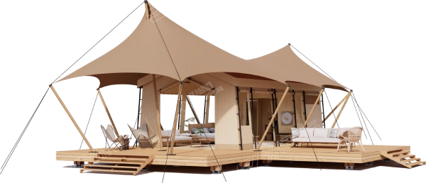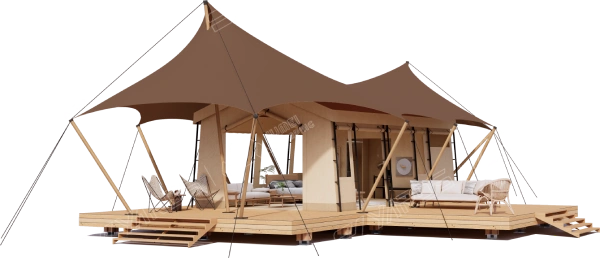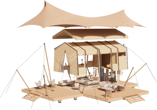 • 1st Roof: Mesh Cloth• 2st Roof: 550g Canvas/PVC Fabric/1050g PVDF Arch. Membrane*• Inner Roofing: 420g Canvas + Fabric Ceiling• Main Struct.: Paint-Coated Steel or Wood Struct.