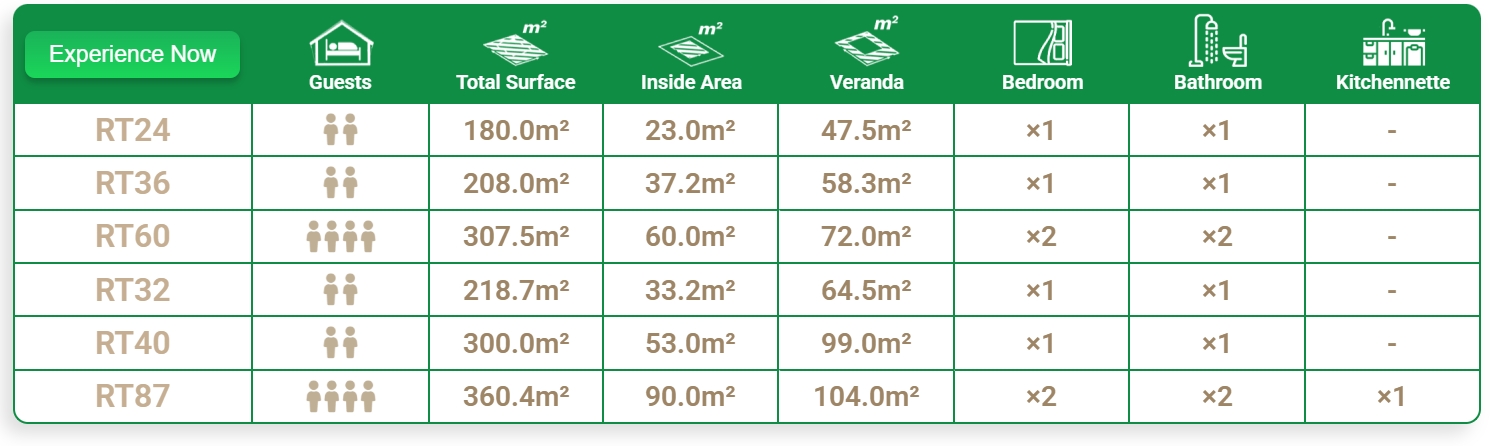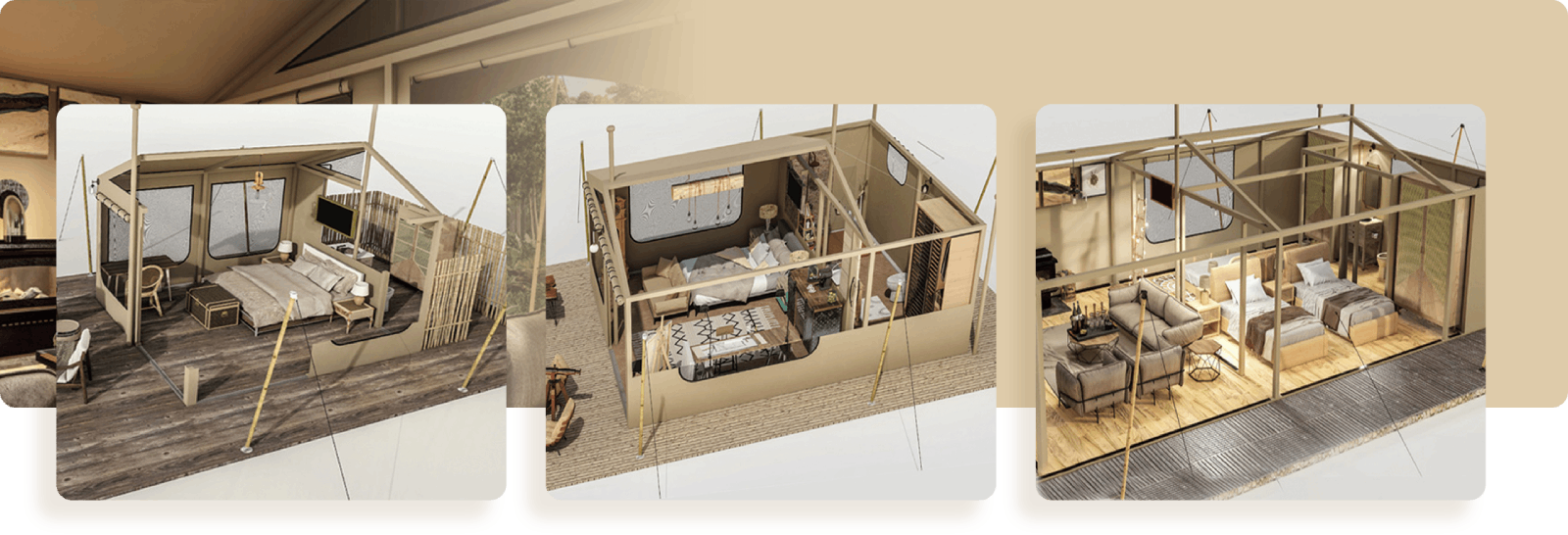 The R/RT series of luxury glamping tents combines tensile and column support, which is strong and durable and suitable for any ground. Customizable standard rooms, suites or multi-function halls are available.