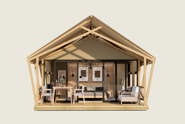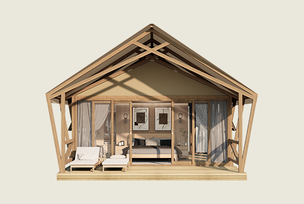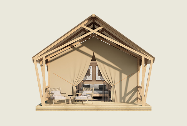 The new classic safari tent (C series) is an upgraded version of the luxury safari tent with square poles, changing the ropes on both sides to solid wood poles, while changing the front door and walls to glass, making the appearance cleaner, fresh and high end. It gives customers who have unique appearance requirements and pursue a sense of luxury one more choice and makes it suitable for more application scenarios such as various multi-functional halls, reception rooms, etc.