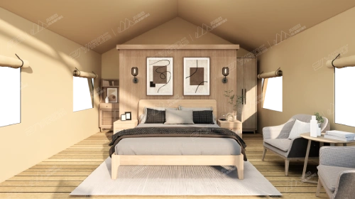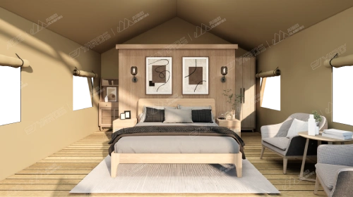 New Classic Safari Tent with Glass Door & Walls – EC32 is an upgraded version of the luxury safari tent with square poles, changing the ropes of both sides to solid wood poles while changing the front door and walls to glass, making the appearance cleaner, fresh and high end. It gives customers who have unique appearance requirements and pursue a sense of luxury one more choice, and make it suitable for more application scenarios such as various multi-functional halls, reception rooms, etc.