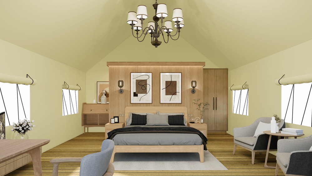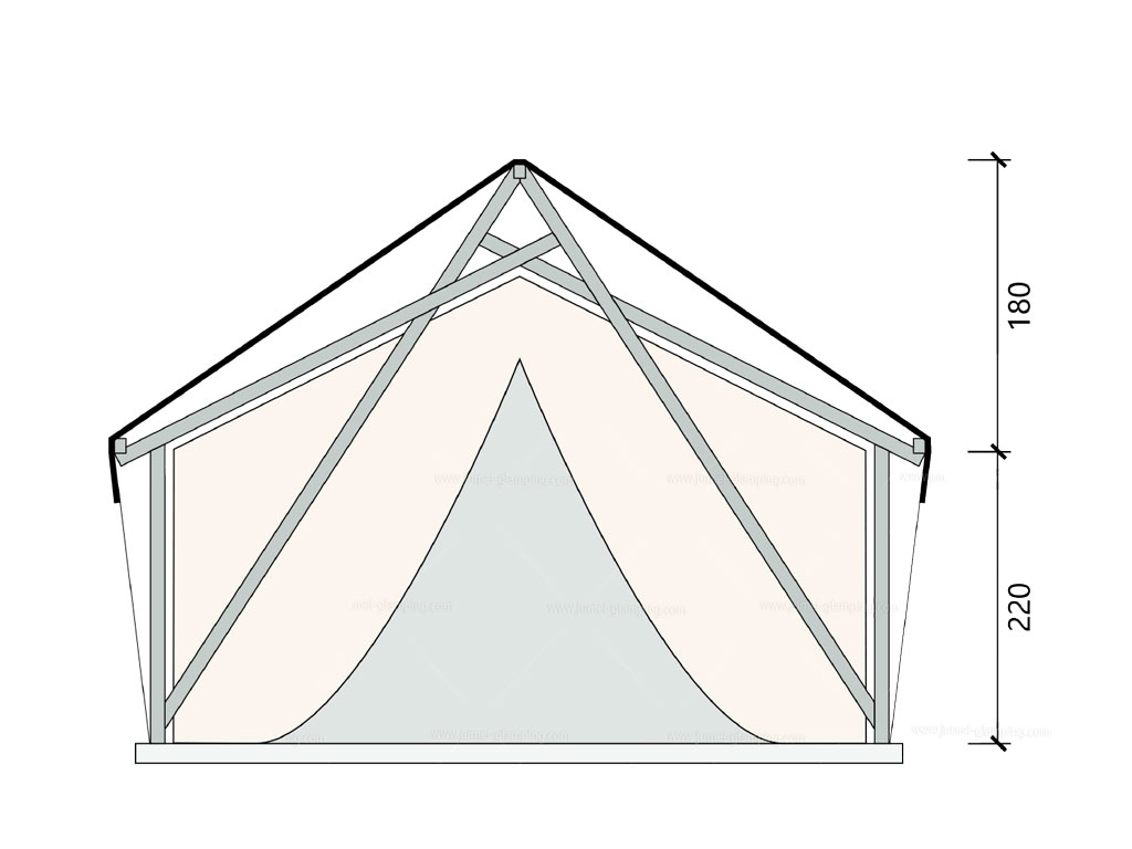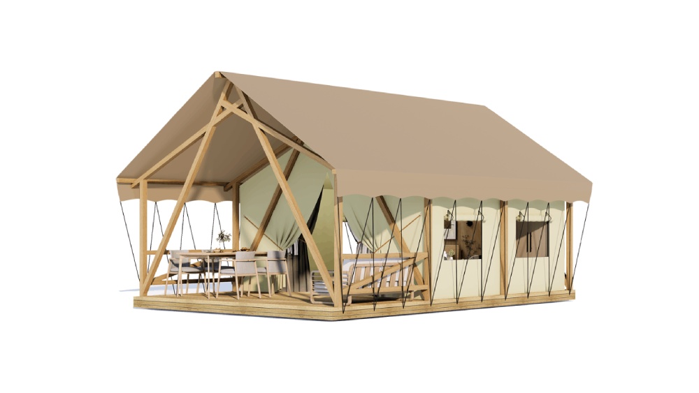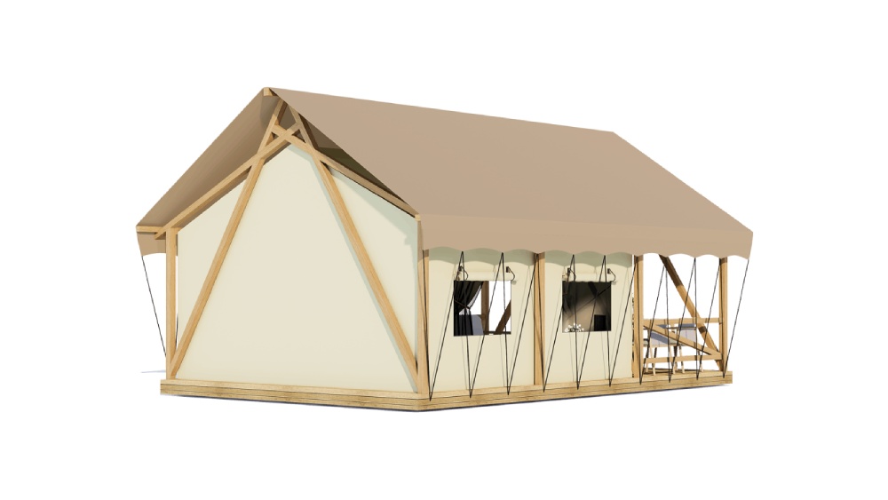 Sunroom Safari Tent with Canvas Walls – E40 combines the features of Luxury Safari Tent(B Series) and New Classic Safari Tent(C series) square poles. We have designed two products, E40 and EX45, of which E40 is a canvas as the side wall and keep the ropes, while EX45 uses Glass walls and doors, without ropes, which are more fitting for the name sunroom.