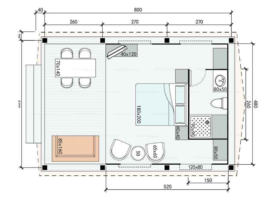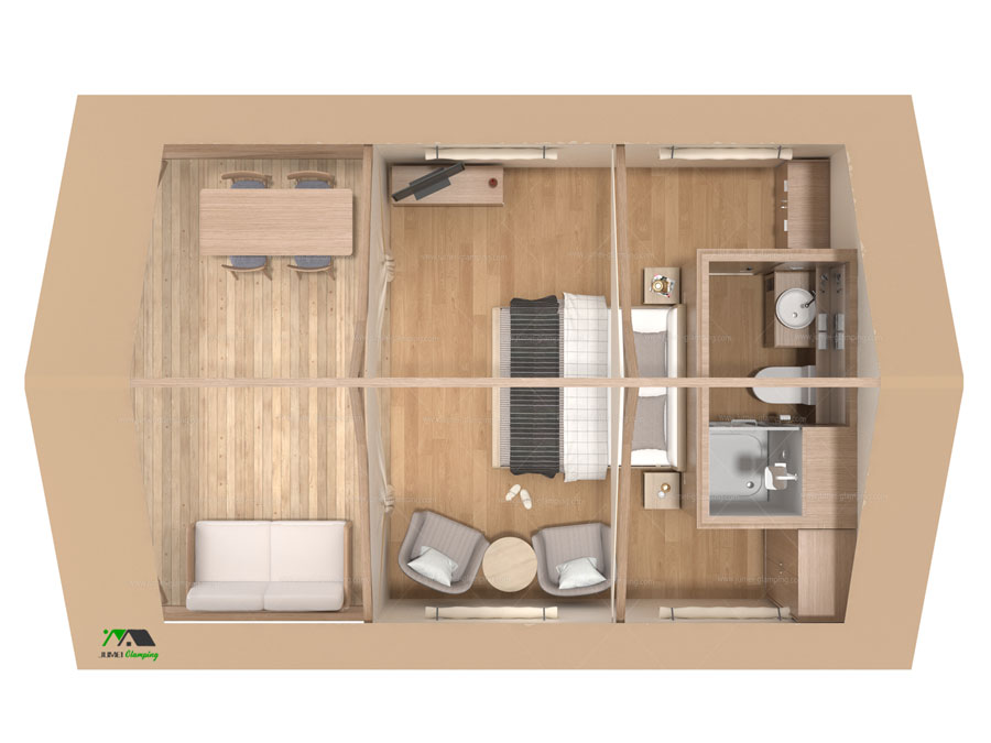 This E-Series safari tent also has a large front balcony, PVC fabric top roof, and premium canvas walls, and you can choose a glass sidewall version of this tent to make it a sunroom. The square solid wood poles provide a spacious, flexible room and a special look, specially selected PVC and canvas fabric with flame retardant, 100% waterproof, UV resistance, tear resistance, and self-cleaning ability.