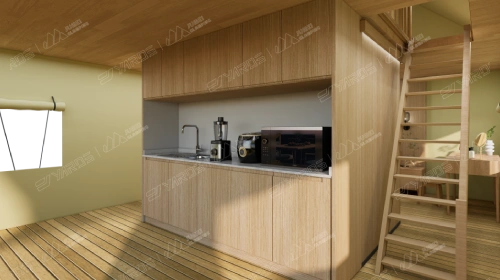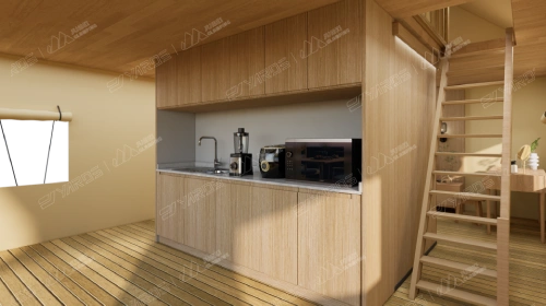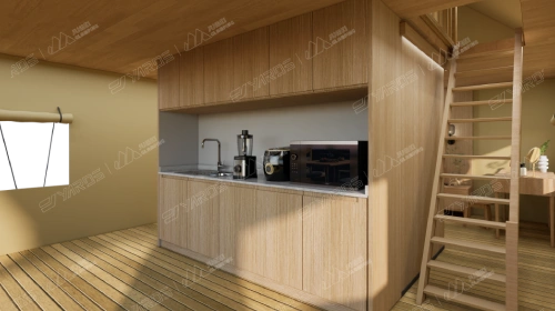 Deluxe Two-Story Safari Tent – BL45 is an upgraded version of the Safari Tent with Attic-B45, extending the Attic of B45 into a full-sized second floor. You can install and equip the kitchen unit, bathroom, bedroom, and other small appliances and facilities on the ground floor. There is also a complete bedroom and a small balcony on the second floor, which is especially suitable for large families.