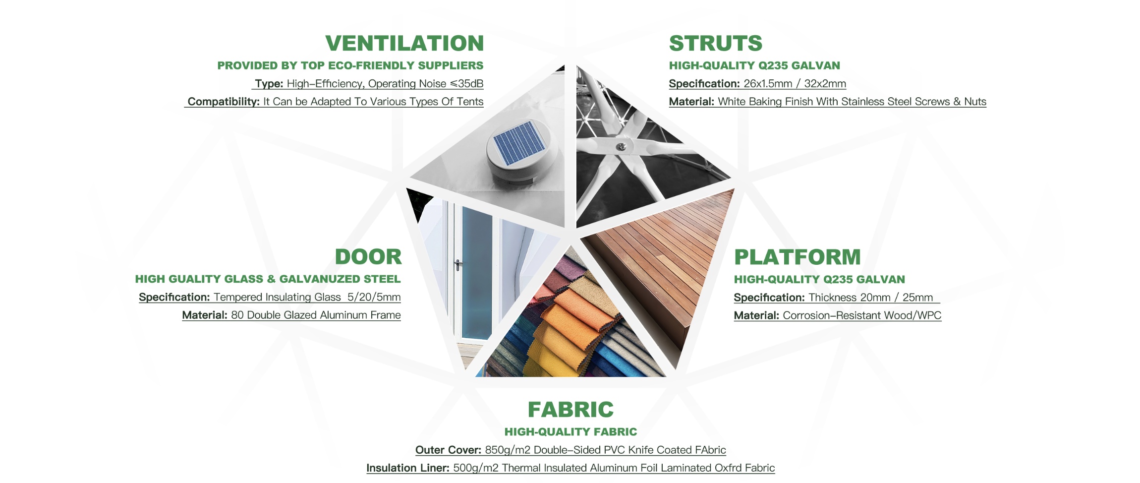 The wind resistance of the tent depends on the connection method of the base. Our glamping dome tent has a solid foundation and can withstand level 11 typhoons, with a snow load of 0.30kN/m.