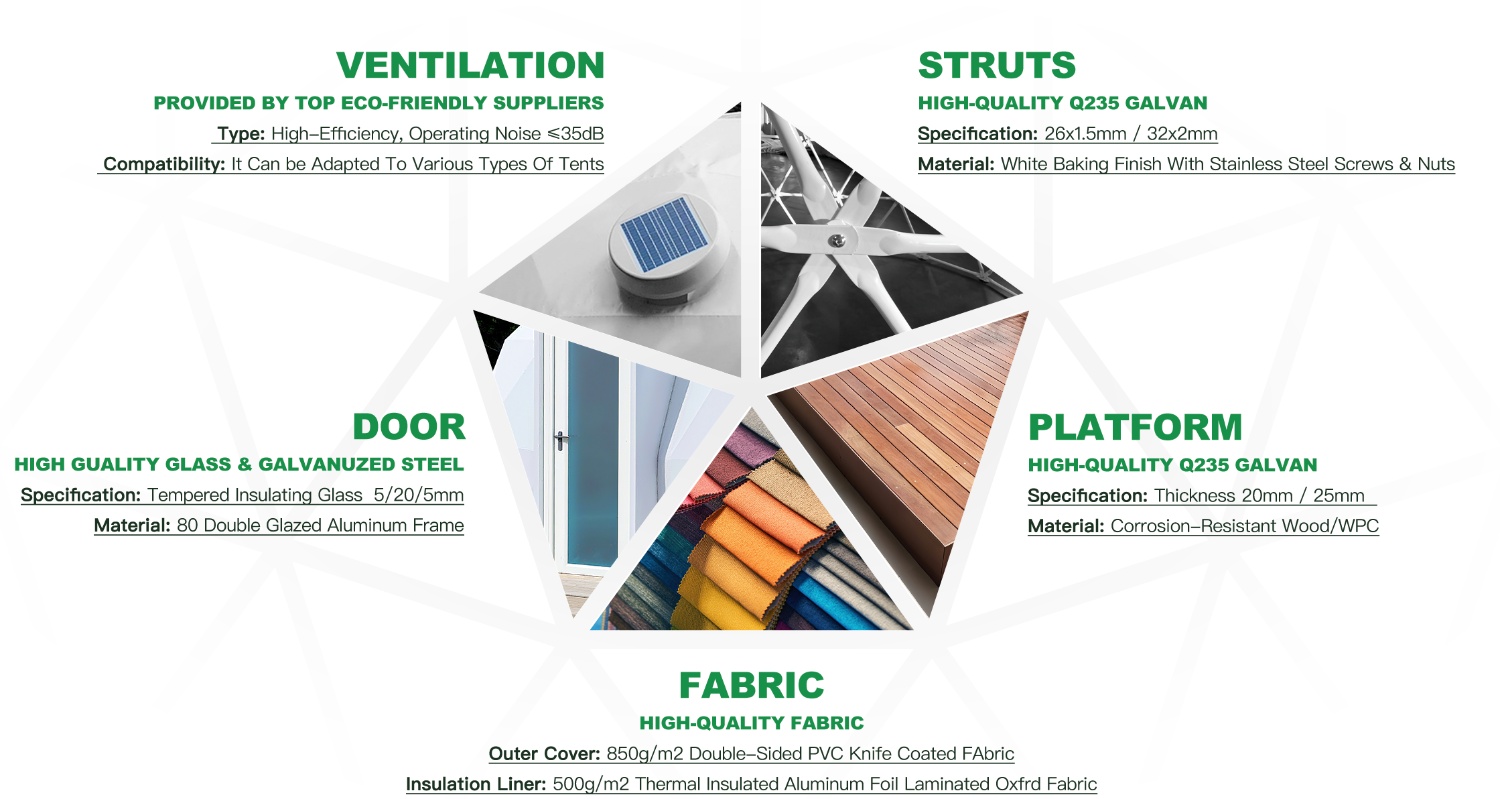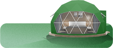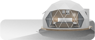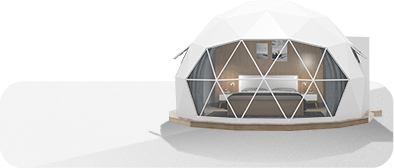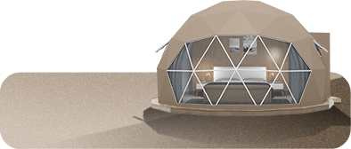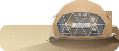 Our dome tent has two-layer of cover fabric and insulation liner. It is suitable for living in various weather conditions from 40℃ to minus 10℃. It will be perfectly fitted in colder or hotter weather with the optional floor heating, air conditioning, fireplace, or other configurations.