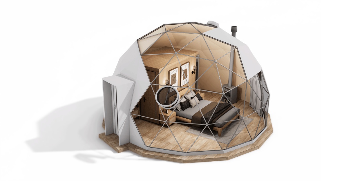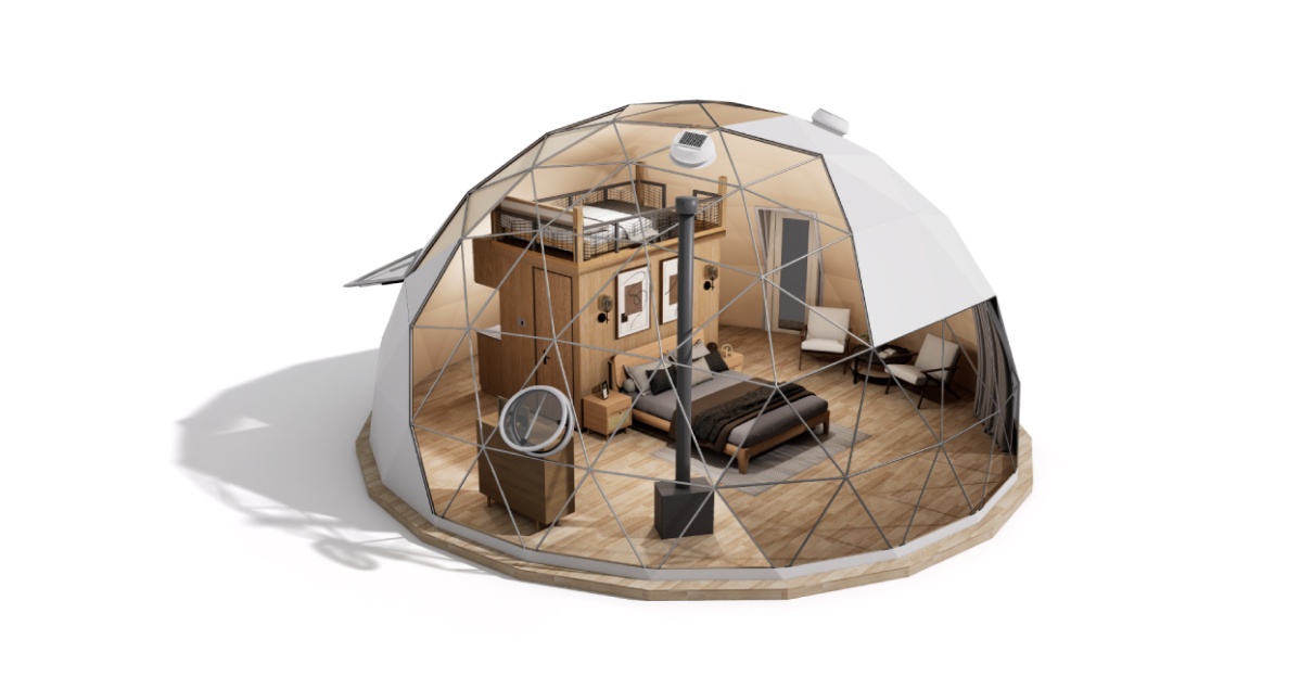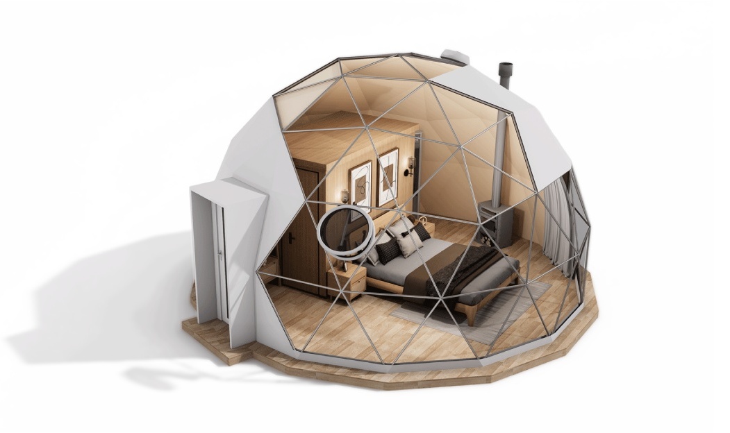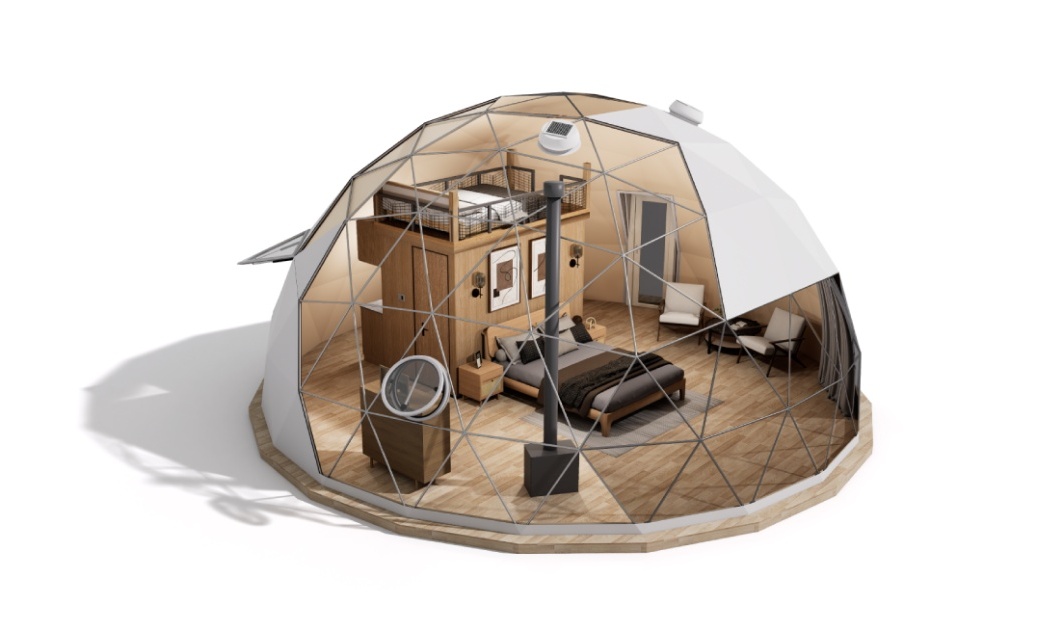 glamping dome tent has an eye-catching and elegant look. it is easy to fully equipped with household facilities, appliances, and kitchenware and can be easily installed everywhere to provide a unique and comfortable living experience.
